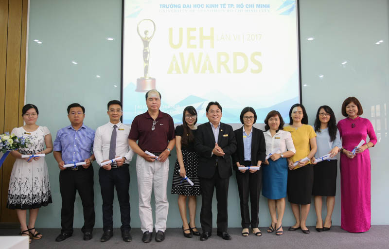 PGS.TS. Nguyễn Hữu Huy Nhựt - Phó Hiệu trưởng UEH trao Bằng khen của Bộ trưởng cho Quý Thầy Cô tại sự kiện UEH Awards Lần VI năm 2017