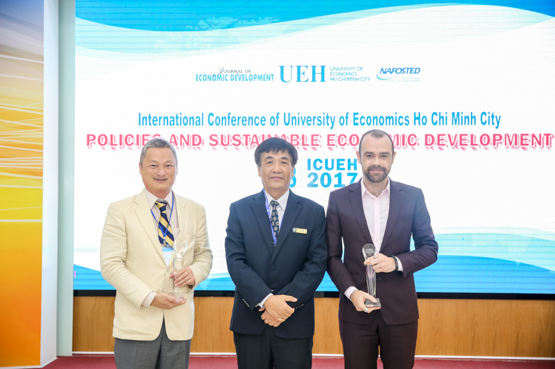 GS.TS. Nguyễn Trọng Hoài - Phó Hiệu trưởng UEH trao quà lưu niệm cho 2 keynote speakers của Hội nghị quốc tế ICUEH 2017 diễn ra tại UEH