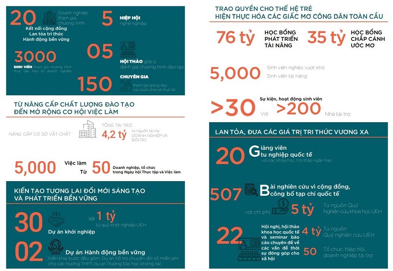 Hạng mục Lan tỏa tri thức: Câu lạc bộ Bất động sản Việt Nam và Câu lạc bộ Bất động sản TP.HCM đóng góp 7 tỷ đồng; Tổng Công ty Điện lực TP. Hồ Chí Minh đóng góp 2,15 tỷ đồng; Hiệp hội Kế toán công chứng Anh Quốc (ACCA) đóng góp 500 triệu đồng; Viện Kế toán công chứng Anh và xứ Wales (ICAEW) đóng góp 500 triệu đồng; Công ty Cổ phần Phần mềm Quản lý Doanh nghiệp (FAST) đóng góp 200 triệu đồng; Ngân hàng TMCP Phương Đông (OCB) đóng góp 100 triệu đồng; Công ty Cổ phần Take Box đóng góp 50 triệu đồng; Các đơn vị đóng góp cho Ngày hội Thực tập và Việc làm UEH đóng góp 799 triệu đồng.