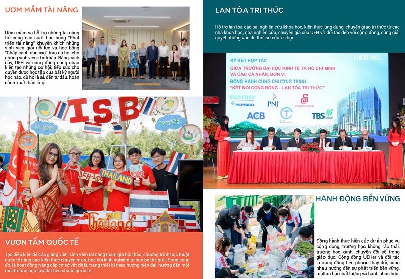Trong rất nhiều thành quả từ chương trình Kết nối cộng đồng – Lan tỏa tri thức – Hành động bền vững, UEH đã vinh danh các đơn vị, tổ chức có nhiều đóng góp lớn cho cộng đồng cùng nhà trường trong năm qua: Công ty Cổ phần Tập Đoàn Thái Bình; Quỹ hỗ trợ tài năng Lương Văn Can; Công ty Cổ phần Chăn Nuôi C.P Việt Nam; Ngân hàng TMCP Phương Đông (OCB); Quỹ học bổng Vallet; Công ty Cổ phần Acecook Việt Nam; Công ty TNHH AEON Việt Nam,...