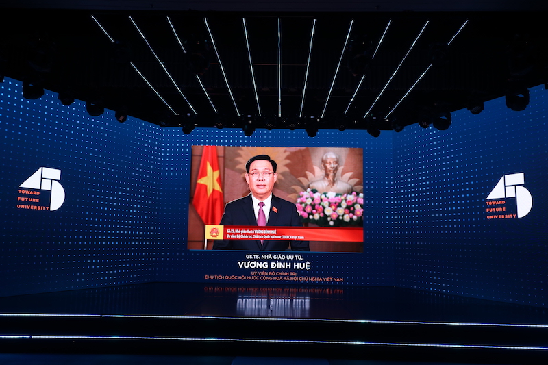 Nhân dịp kỷ niệm 45 năm UEH, thay mặt lãnh đạo Đảng, Nhà nước, GS.TS. Vương Đình Huệ - Ủy viên Bộ Chính trị, Chủ tịch Quốc hội nước Cộng hòa xã hội chủ nghĩa Việt Nam Việt Nam đã nhiệt liệt hoan nghênh, gửi lời chúc mừng và biểu dương những kết quả, thành tích xuất sắc mà Trường Đại học Kinh tế TP. Hồ Chí Minh đã đạt được trong 45 năm qua. “Trong thời gian tới, với vị thế là một trung tâm đào tạo và nghiên cứu hàng đầu của đất nước, giữ vai trò chủ lực trong đào tạo nguồn nhân lực chất lượng cao, Trường Đại học Kinh tế TP. Hồ Chí Minh cần tiếp tục quán triệt sâu sắc, thực hiện có hiệu quả các chủ trương, chính sách của Đảng, Nhà nước về giáo dục, đào tạo, trọng tâm là Nghị quyết Đại hội lần thứ XIII của Đảng; Tiếp tục đi đầu trong đổi mới, sáng tạo trong đào tạo, nghiên cứu khoa học và tiên phong trong hội nhập. Thực hiện thành công mô hình Đại học theo tinh thần luật giáo dục đại học sửa đổi năm 2018” - GS.TS. Vương Đình Huệ chia sẻ.