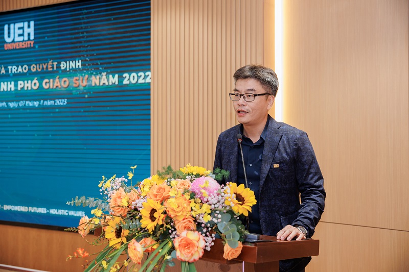 Năm 2022, 4 Thầy/Cô UEH đã được Hội đồng Giáo sư Nhà nước ký quyết định công nhận đạt tiêu chuẩn chức danh Phó Giáo sư. Nhằm thể hiện sự trân trọng, ghi nhận những nỗ lực, phấn đấu của các tân Phó Giáo sư trong suốt quá trình công tác, giảng dạy và nghiên cứu khoa học, trong khuôn khổ chương trình, UEH đã long trọng tổ chức Lễ công bố và trao quyết định bổ nhiệm chức danh Phó Giáo sư năm 2022 cho: PGS.TS. Đặng Văn Cường - Bộ môn Tài chính công, Khoa Tài chính công; PGS.TS. Phạm Khánh Nam - Phó Hiệu trưởng Trường Kinh tế, Luật và Quản lý nhà nước UEH; PGS.TS. Nguyễn Huỳnh Trang - Giám đốc chương trình đào tạo ngành Ngôn ngữ Anh, khoa Ngoại ngữ; PGS.TS. Trần Phương Thảo - Phó Viện trưởng Viện Đào tạo quốc tế.
