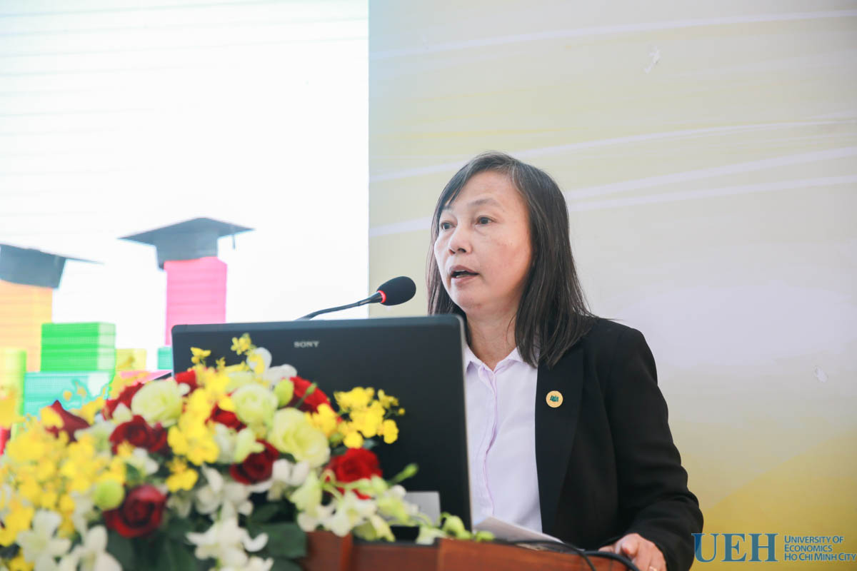 TS. Lý Thị Minh Châu - Trưởng Phòng Đảm bảo chất lượng - Phát triển chương trình đã chia sẻ về các tiêu chí đánh giá trường đại học của bảng xếp hạng QS châu Á và giải pháp thúc đẩy việc đưa UEH tham gia bảng xếp hạng này.