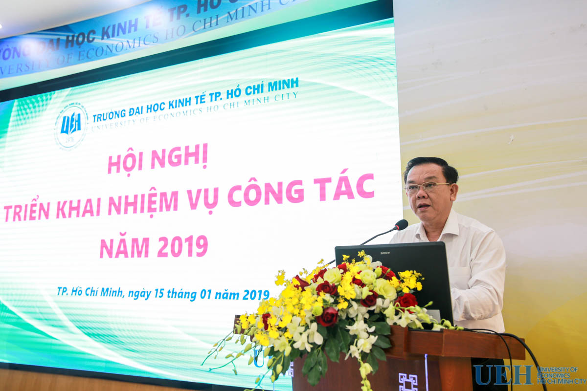 Mở đầu Hội nghị, GS.TS. Nguyễn Đông Phong - Hiệu trưởng UEH đã trình bày 26 nội dung, hoạt động trọng tâm năm 2019 trên các mặt hoạt động: đào tạo, nghiên cứu khoa học, hợp tác trong và ngoài nước, quản trị nhà trường.