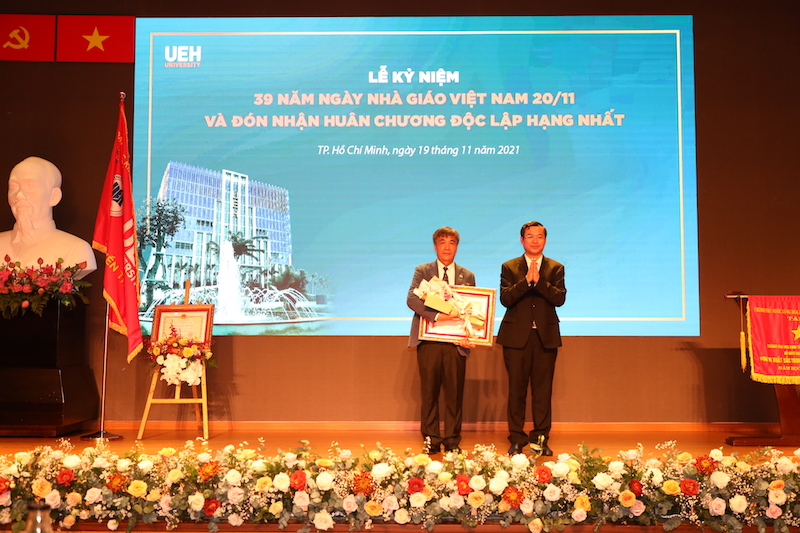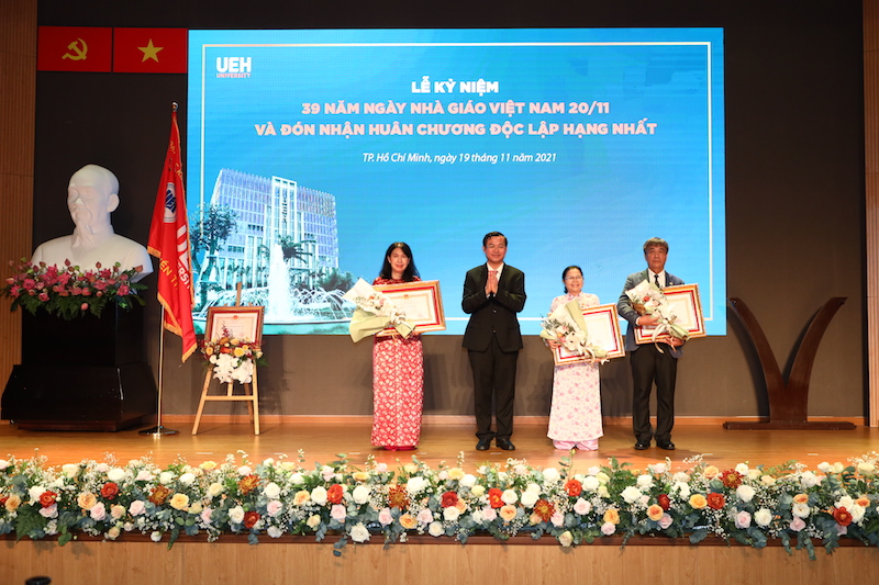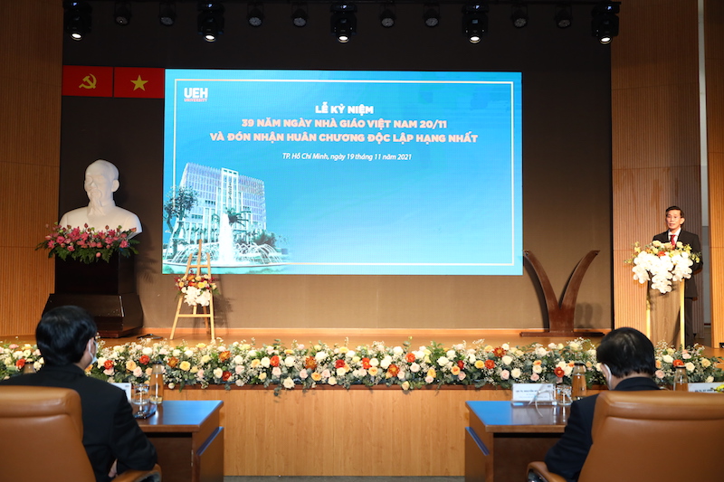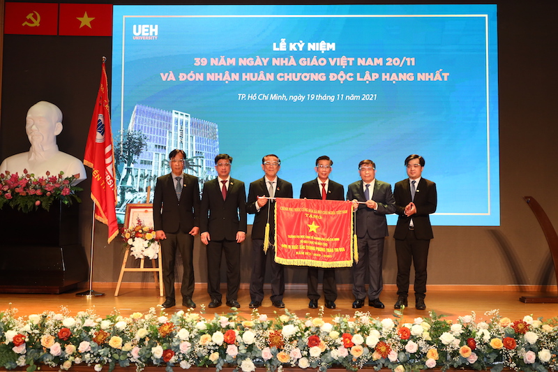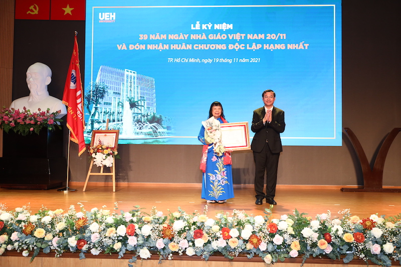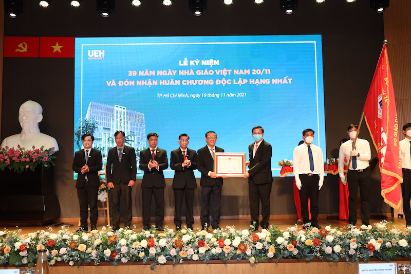 Sáng ngày 19/11/2021, Trường Đại học Kinh tế TP. Hồ Chí Minh (UEH) đã long trọng tổ chức Lễ kỷ niệm 39 năm Ngày Nhà giáo Việt Nam (20/11/1982 - 20/11/2021) và vinh dự đón nhận Huân chương Độc lập Hạng nhất của Chủ tịch nước Cộng hòa xã hội chủ nghĩa Việt Nam trao tặng. Đây là minh chứng cho những nỗ lực và cống hiến không ngừng của tập thể lãnh đạo, quý Thầy, Cô, viên chức và người lao động UEH trong sự nghiệp giáo dục đại học và góp phần xây dựng, phát triển kinh tế - xã hội của đất nước trong suốt 45 năm qua